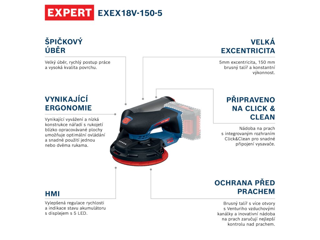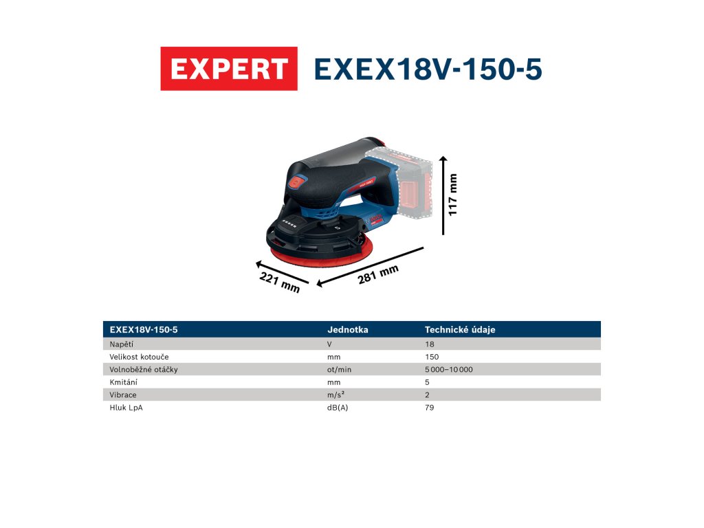 - Excentrická bruska EXEX18V-150-5 EXPERT nabízí vynikající úběr, rychlý postup práce a vysokou kvalitu povrchu.