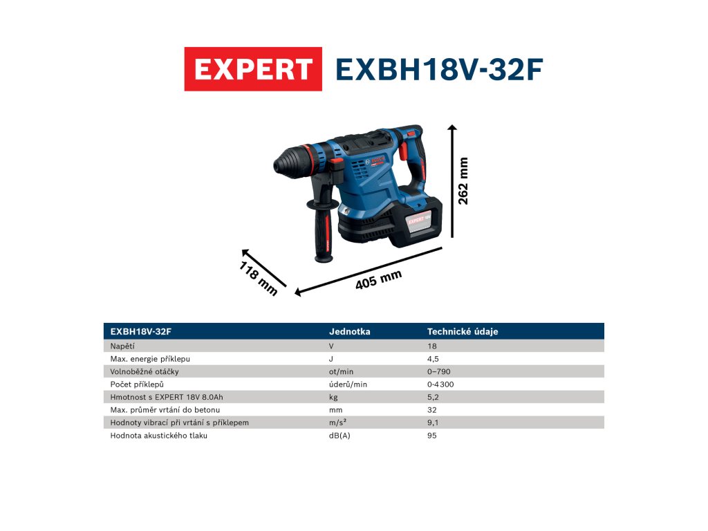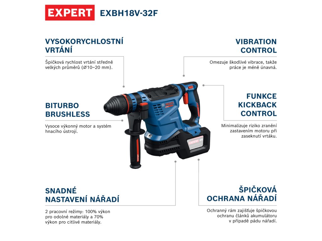 - EXBH18V-32F EXPERT je robustní, vysokorychlostní vrtací kladivo SDS plus pro vrtání velkých a hlubokých otvorů.