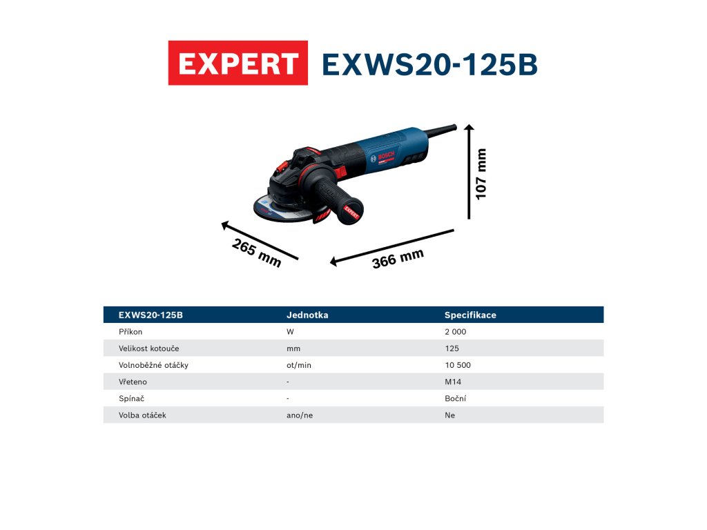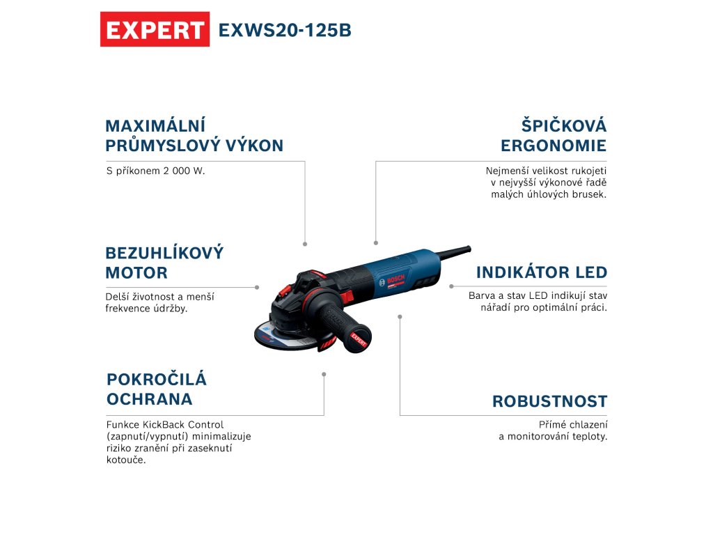 - EXWS20-125B EXPERT poskytuje maximální průmyslový výkon díky svému enormnímu příkonu 2 000 W.
