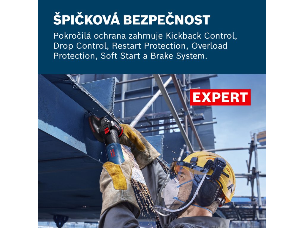 - EXWS20-125B EXPERT nabízí nejlepší bezpečnost uživatele ve svém segmentu s řadou pokročilých ochranných funkcí, jako jsou KickBack Control (zastaví motor, když se nářadí zasekne), Drop Control (vypne motor při pádu nářadí), Restart Protection (vypne motor, aby se automaticky znovu nespustil po výpadku napájení), ochrana proti přetížení (chrání před přehřátím), Soft Start a Brake System.